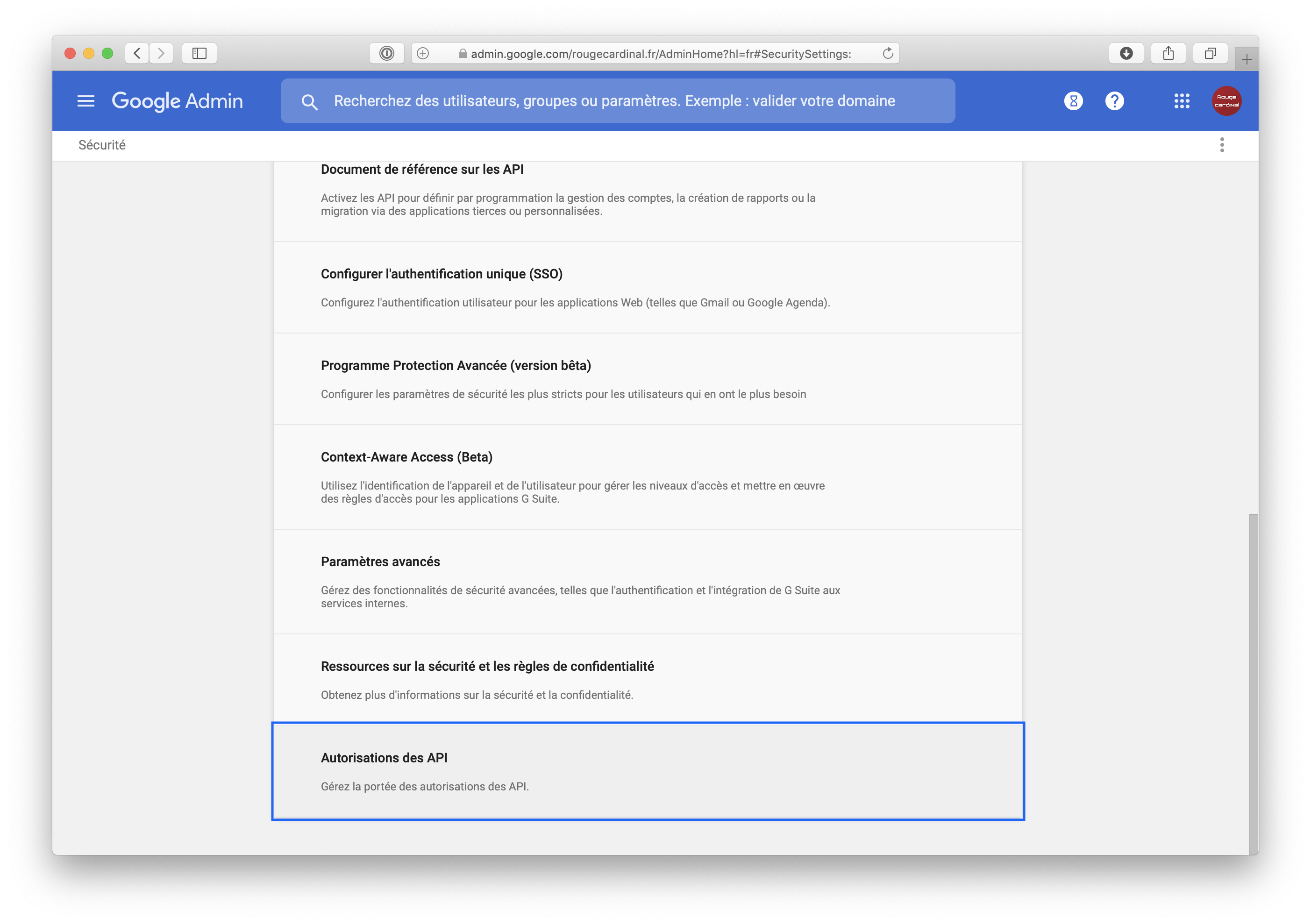 Scroll to the bottom of the list and click API Autorisations