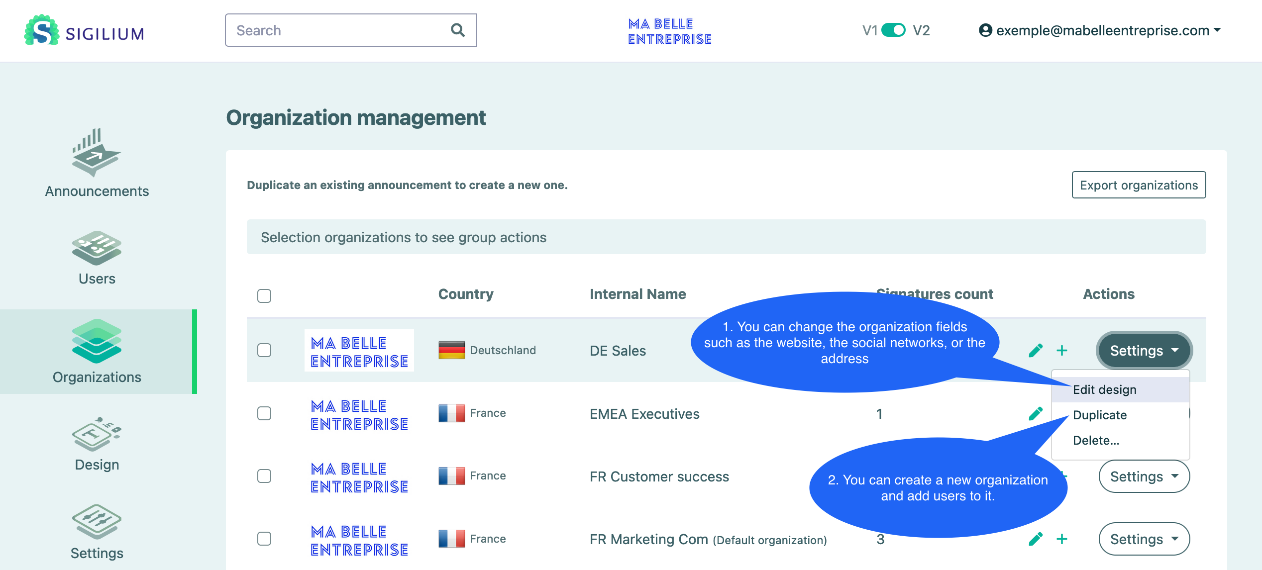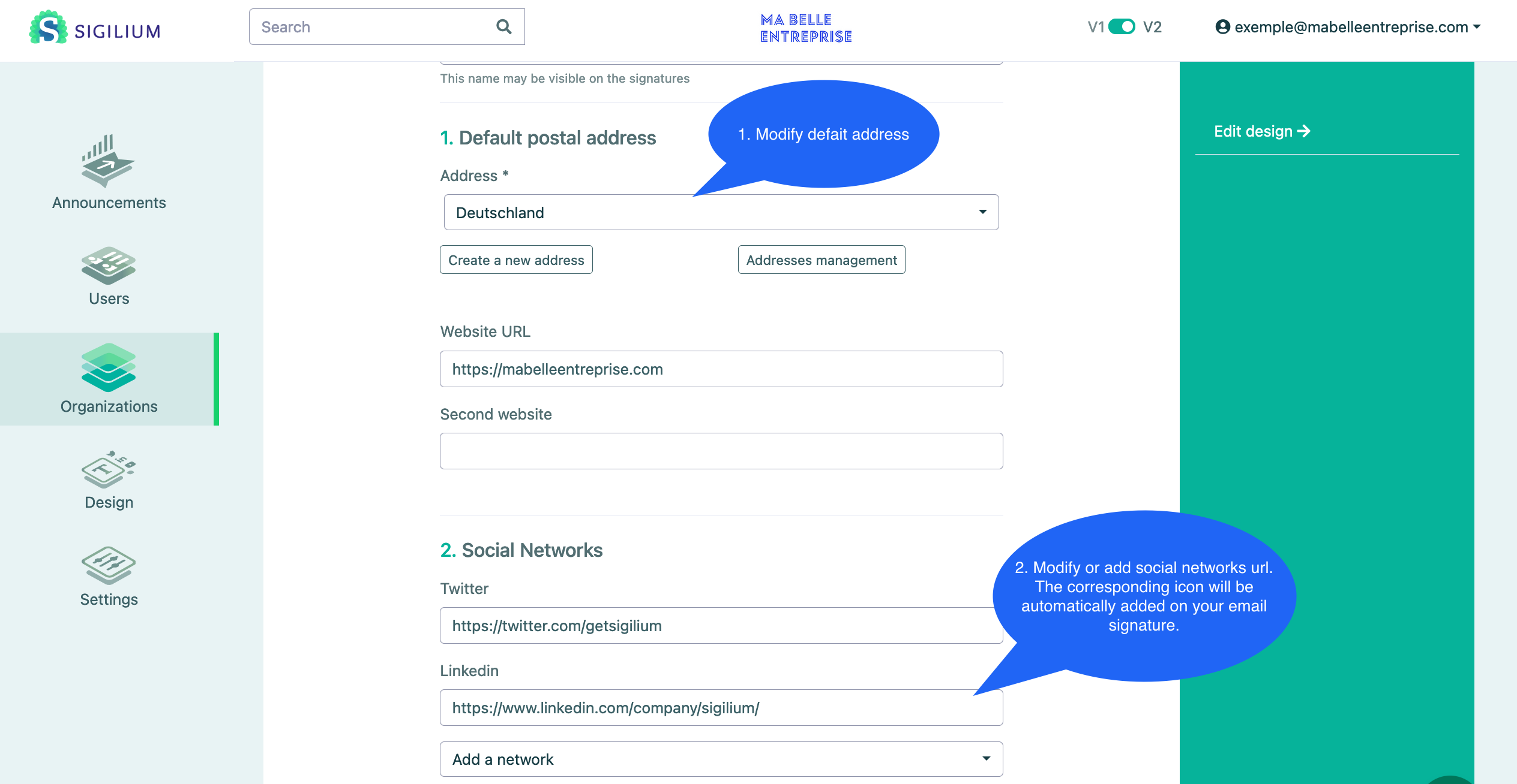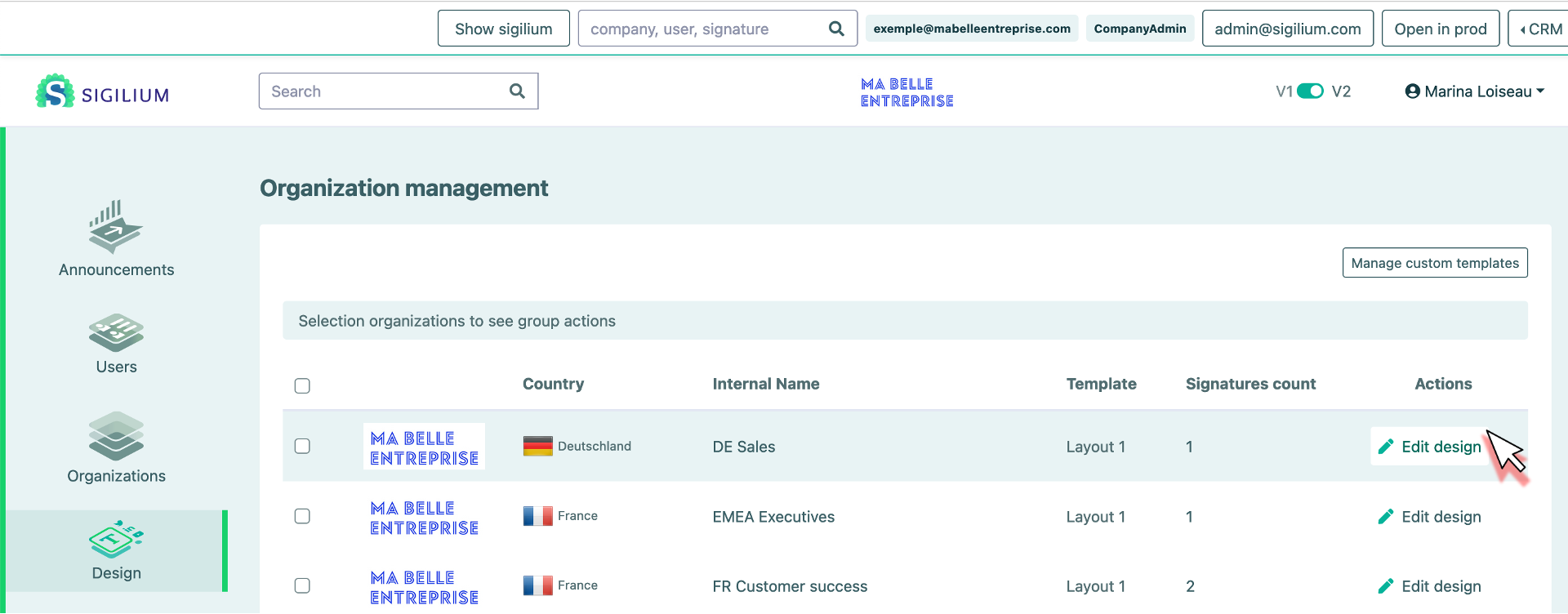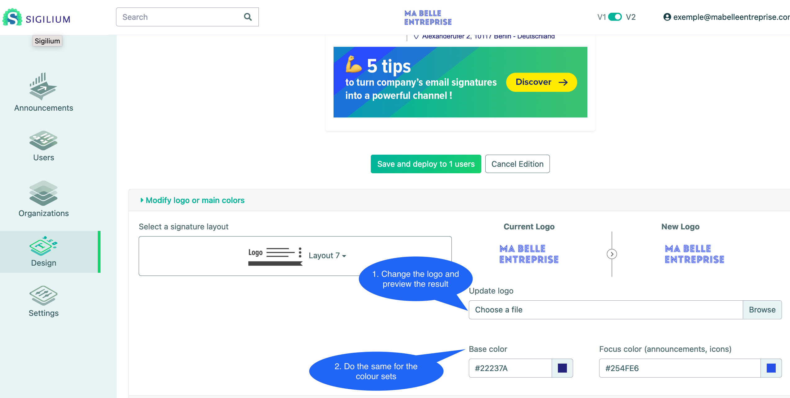You can choose and preview the signature, among a list of preset templates. Click on the Preview button then Save and deploy. You can choose which organisations are concerned by the update.