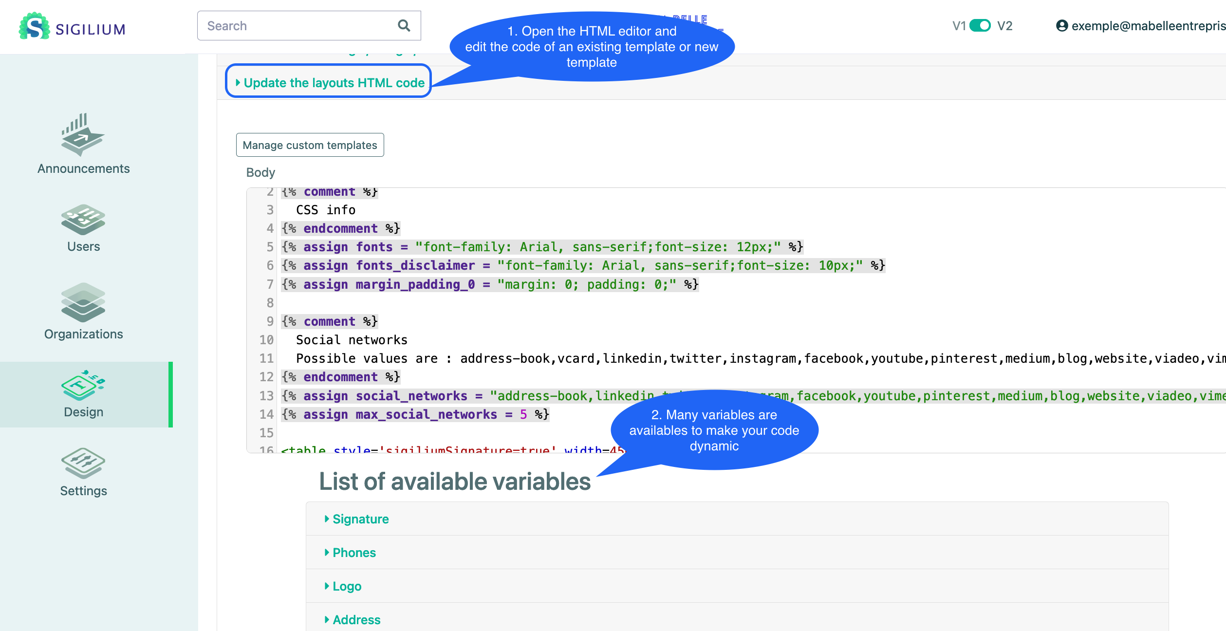 Sigilium HTML Editor helps you customise the code of a template or copy paste your HTML code. It helps you modify (font, size, colors, order of elements, etc...). Take look at the listed variables and turn your initial static html code into a dynamic template of signature!