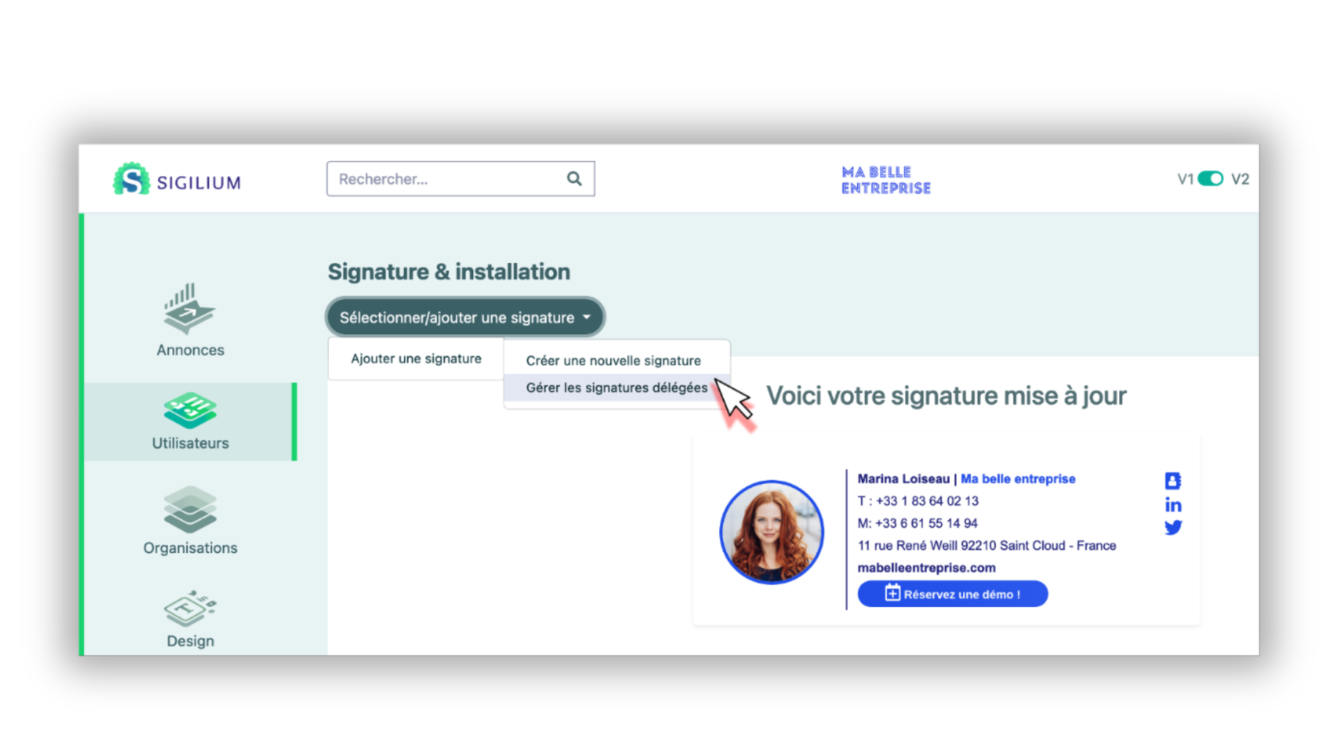 Créez ou allez sur la page de votre signature email générique ex : "devis@monentreprise.fr". Un bouton apparait désormais en haut à droite de la page. Il vous permet d'associer une signature à un plusieurs personnes et / ou de créer plusieurs signatures email pour cette adresse email.
