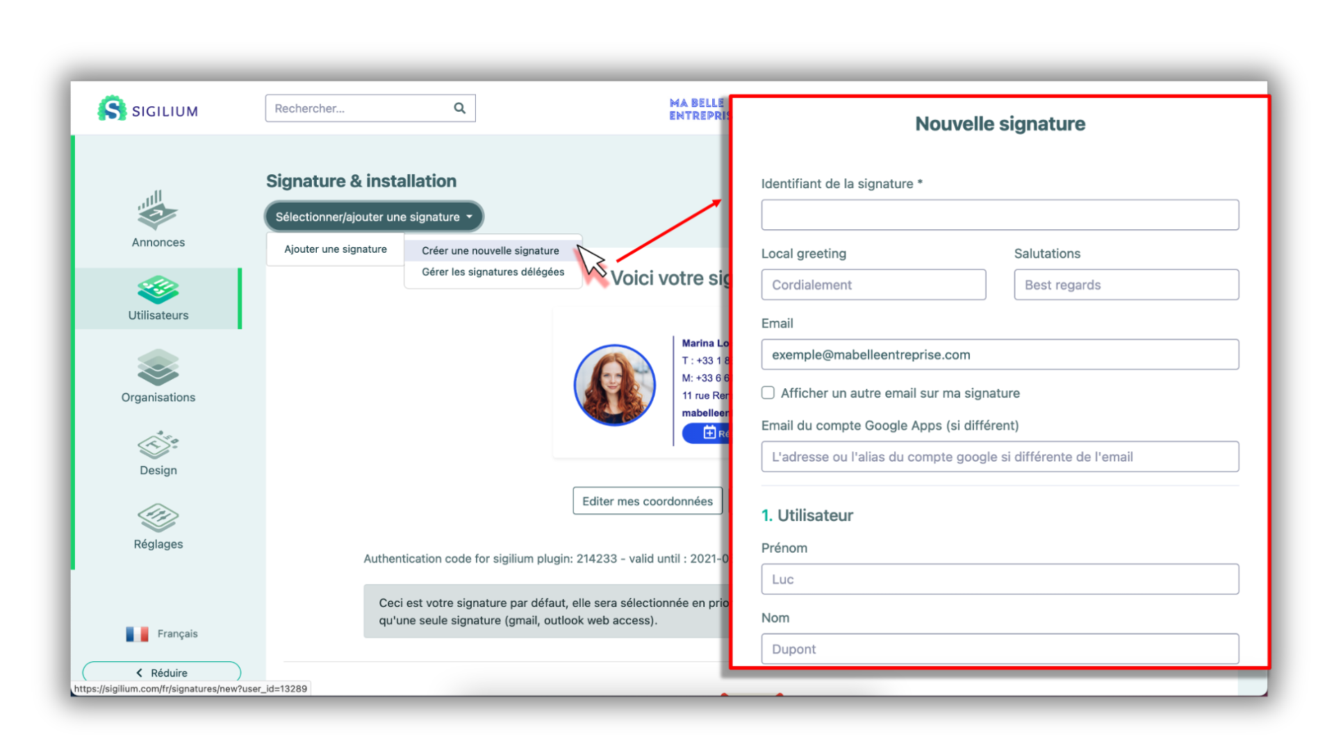 Nommez la signature de manière claire (ex d'ID : "Signature Devis Marina") et remplissez les coordonnées que vous voulez faire apparaitre.