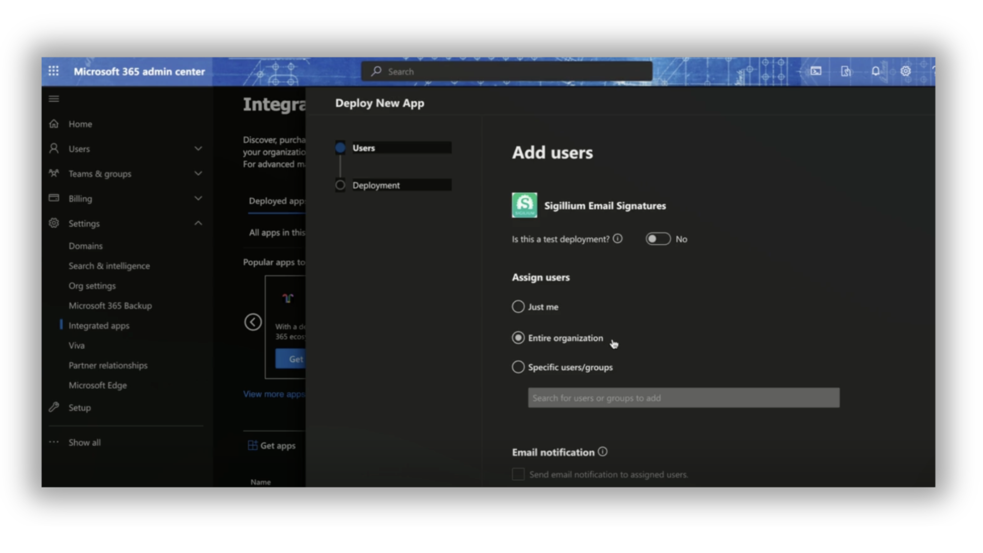You can now activate the deployment of email signatures from the Settings menu of your Sigilium's account. And send an automatic installation message to users from the Users page.
