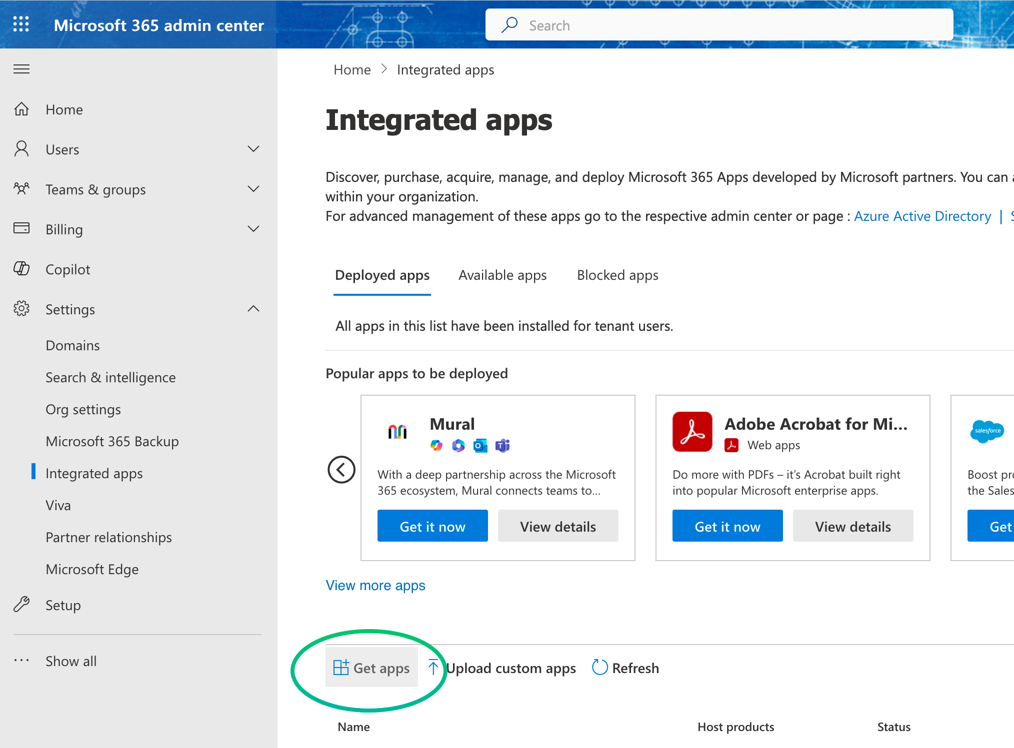Direct link: https://admin.microsoft.com/#/Settings/IntegratedApps