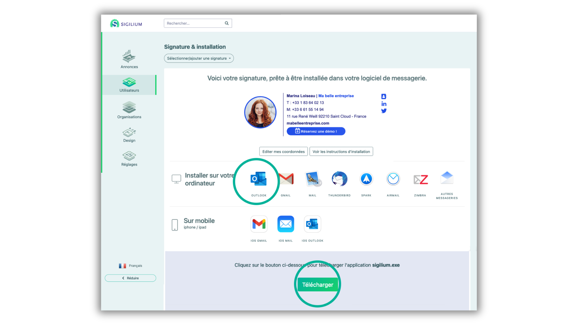 2 - Click on the button Install my signature. It will send you to your Sigilium Space.