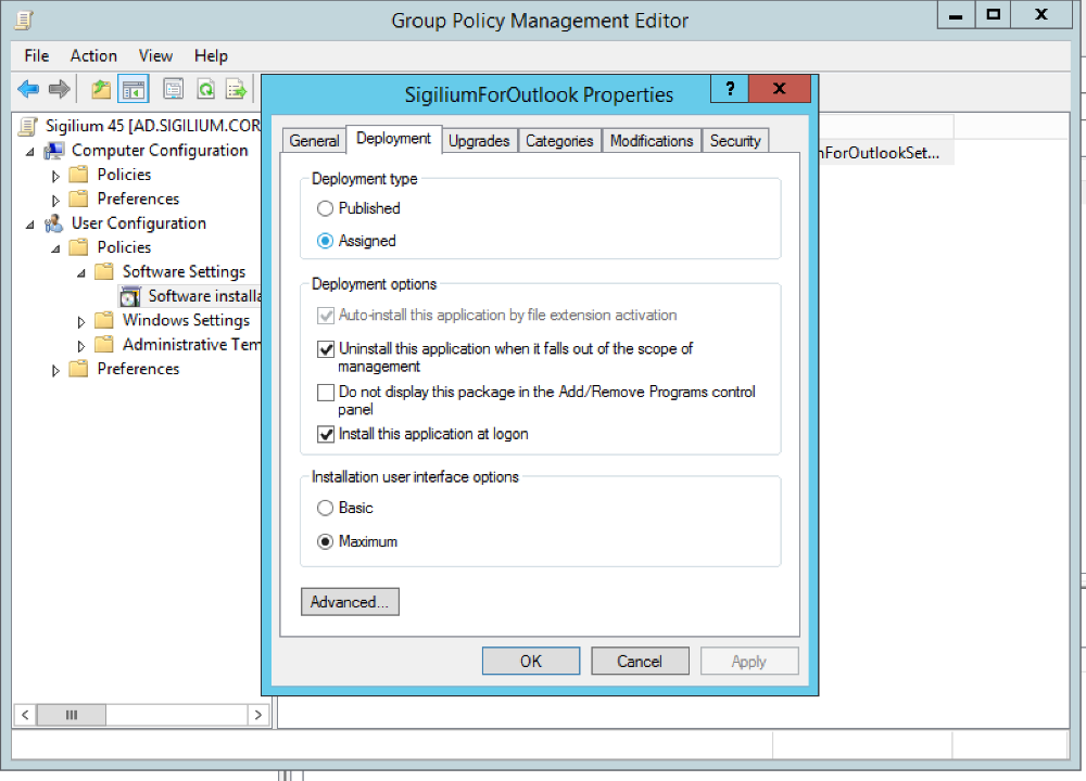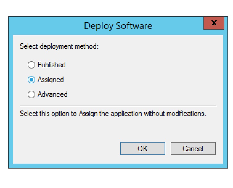 6/ Sélectionnez le MSI, puis choisissez Assigned dans la boite de dialogue Deploy Software.
