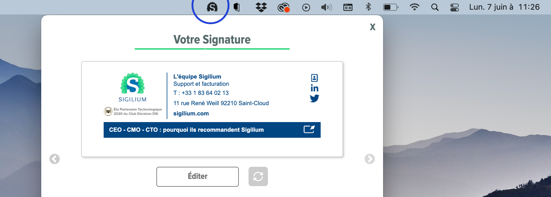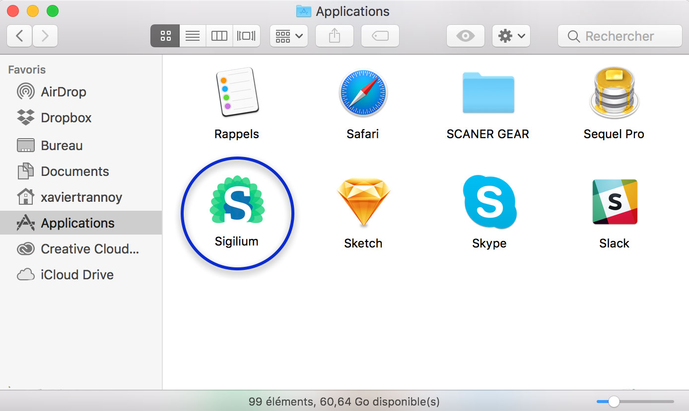 cliquez sur Sigilium > l’icône apparait maintenant en haut dans la barre de menu