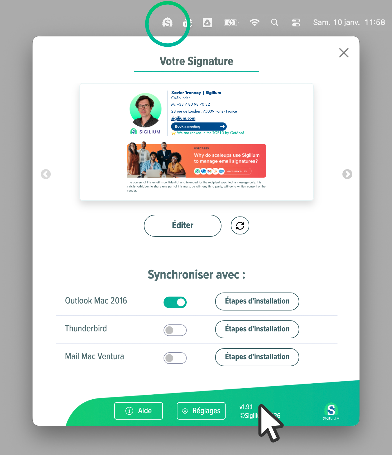 Then in the green area, click on the Sigilium app version number, and the app update will start automatically.