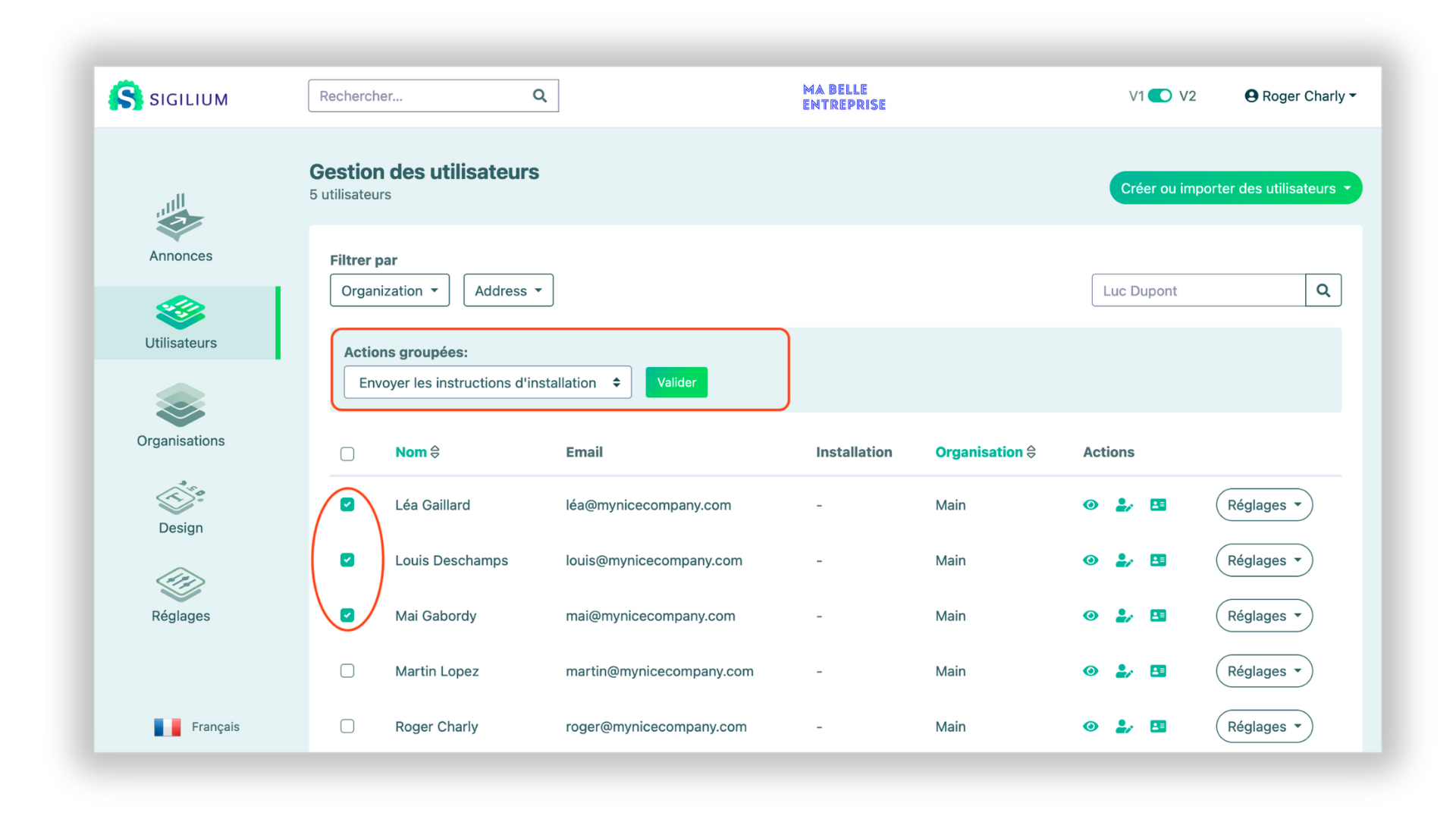 2 - En haut de la liste des utilisateurs, cliquez sur Sélectionner une action > Envoyer les instructions d'installation