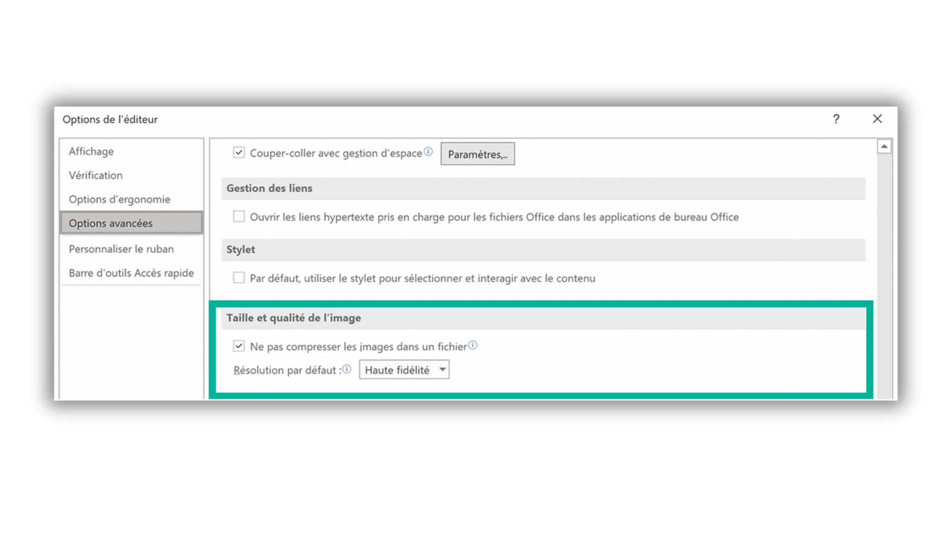 Dans Options avancées, scrollez jusqu'à la partie : Taille et qualité de l'image