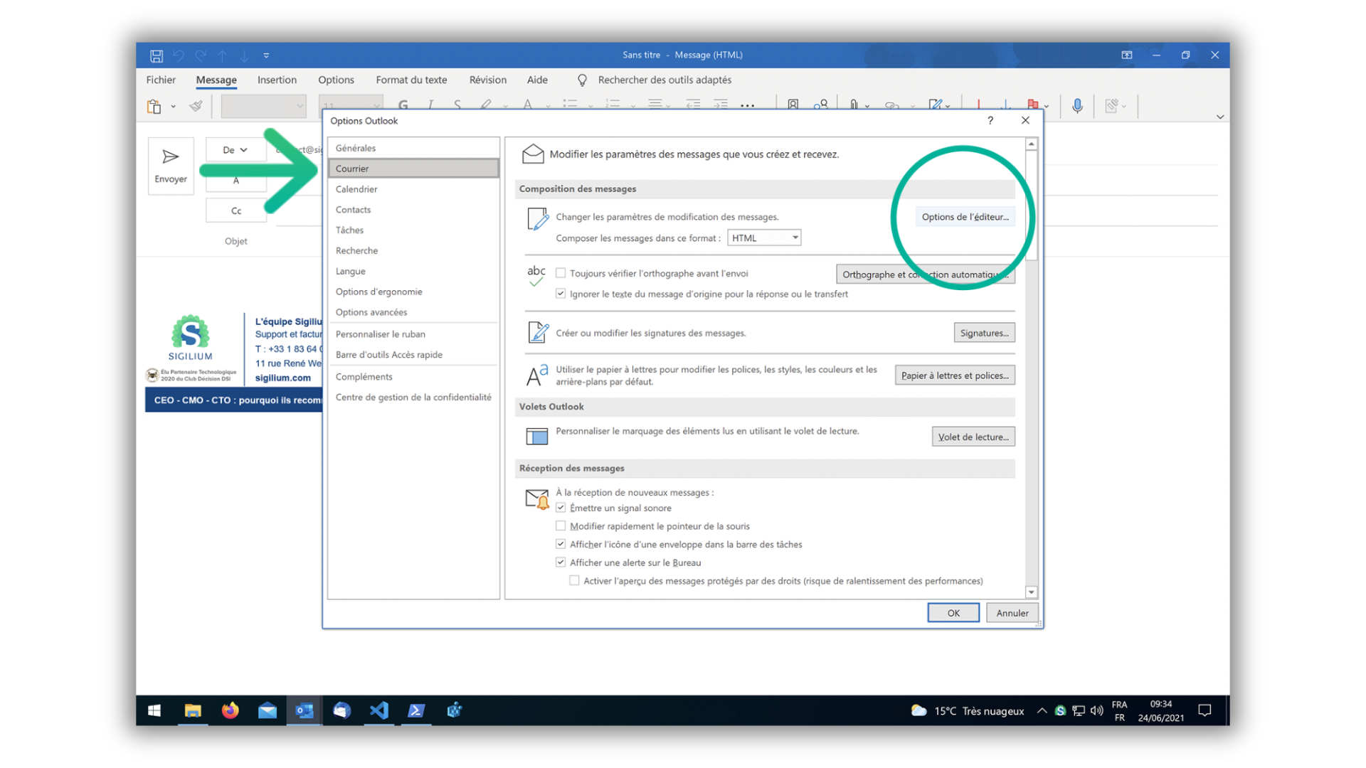 Créez un nouvel email. Allez dans Fichier > Options > Courrier