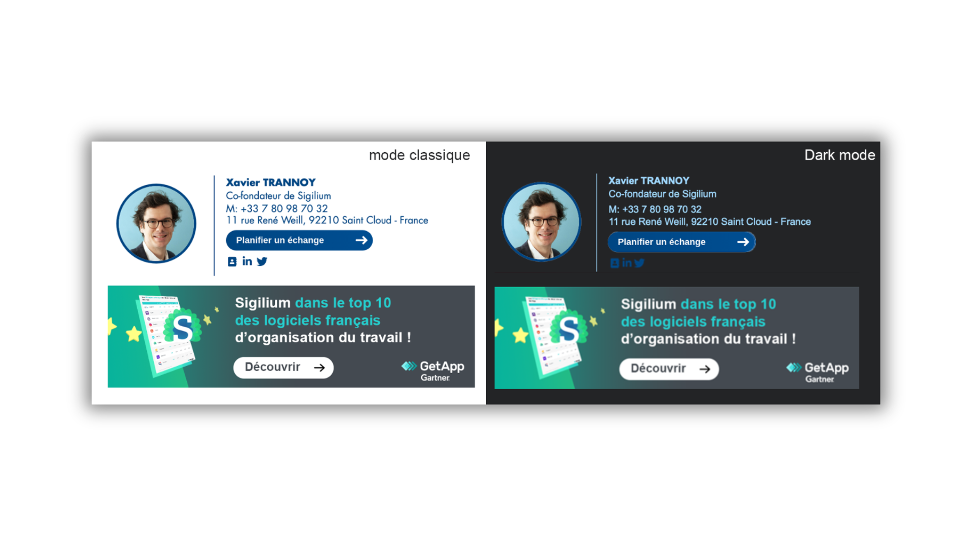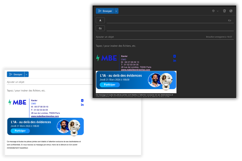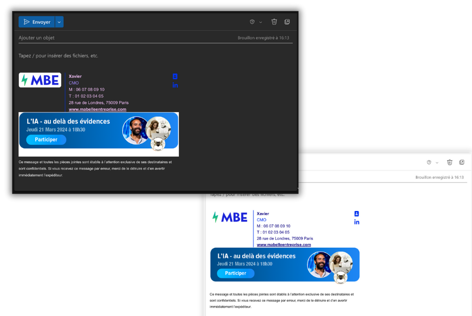 Voici un exemple de rendu de signature email dans les deux mode :