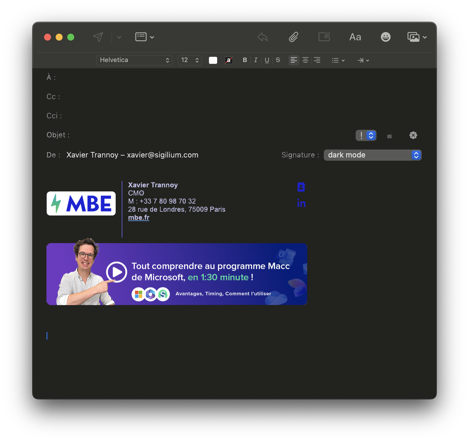 Exemple : des coordonnées en noir ((#000000) seront automatiquement détectées par la messagerie et adaptées en blanc lorsque le dark mode est activé.