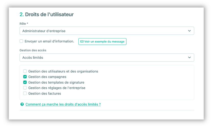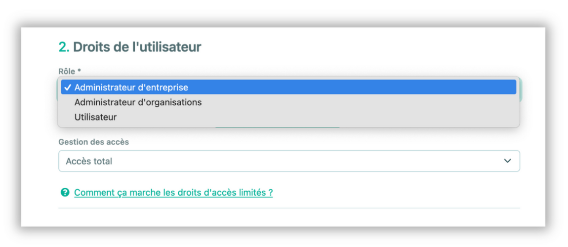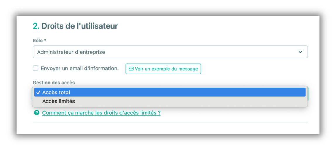 Pour limiter son rôle à des droits spécifiques, optez pour "Accès limité" et choisissez lesquels.