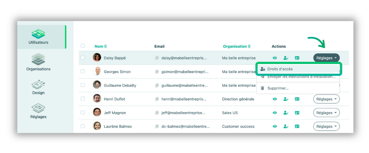 Commencez par cliquer sur "Utilisateurs" dans la barre de navigation à gauche pour afficher la liste des utilisateurs de votre entreprise. Sélectionnez l’utilisateur souhaité et accédez à ses droits via le bouton Réglages > Droits d’accès."Utilisateurs"