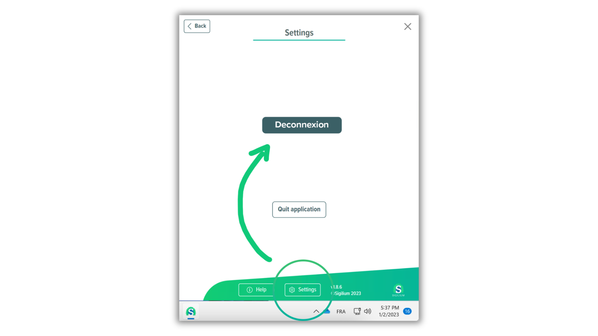 Dans la partie verte, cliquez sur le bouton Réglages > Deconnexion.