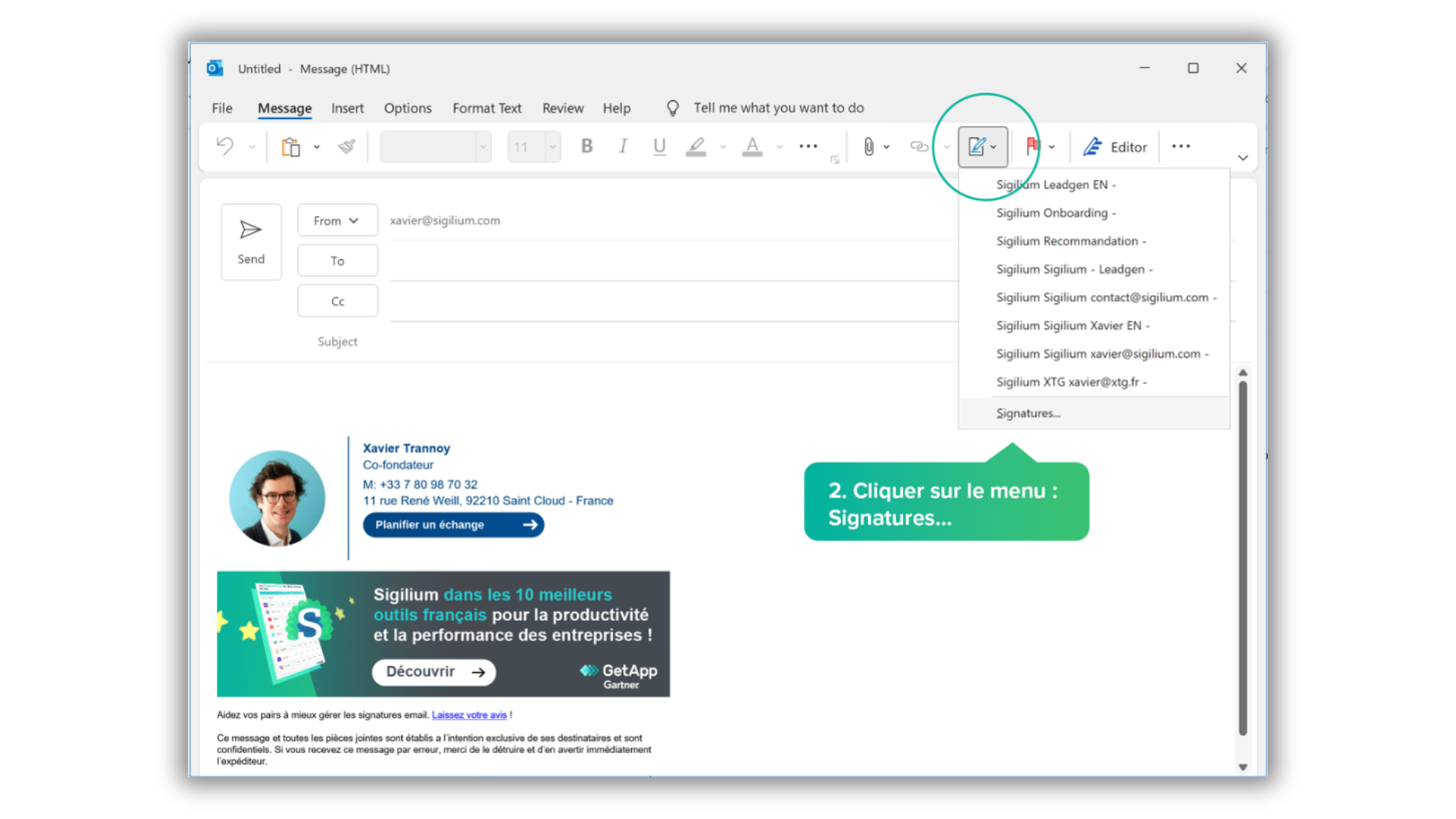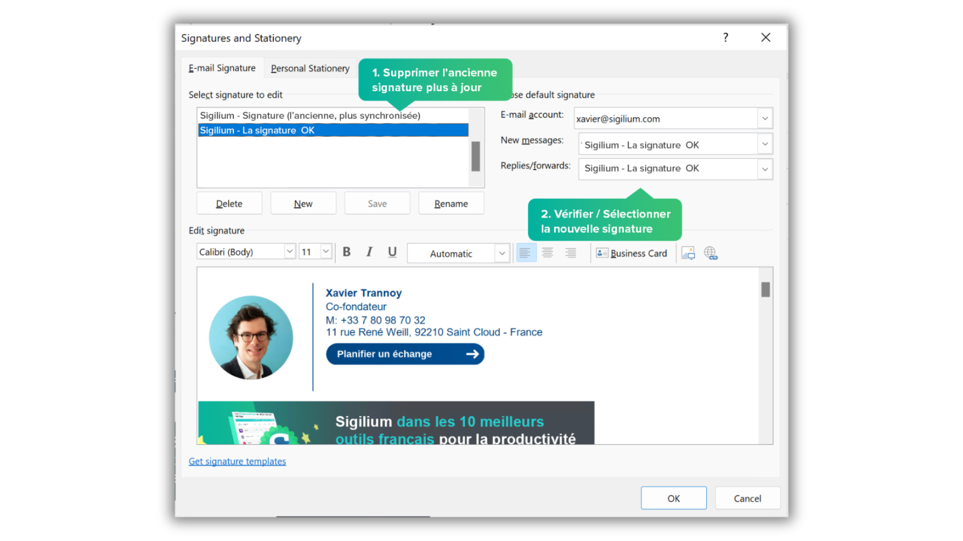 Dans la liste de vos signatures sur Outlook, une nouvelle signatures est apparue.