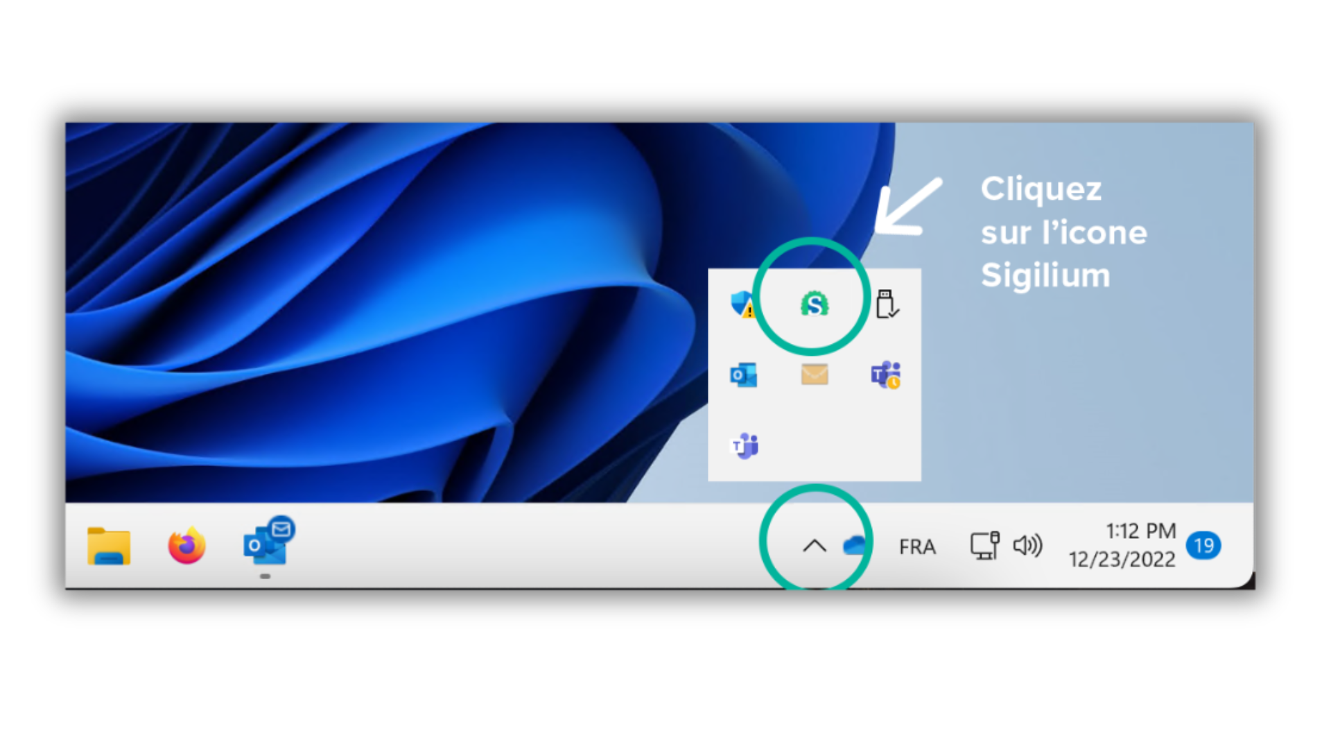 Dans la barre de menu, en bas à droite de votre écran, une icône en forme d'accent circonfexe [ ^ ] vous permet de retrouver l'application Sigilium. Cliquez dessus.