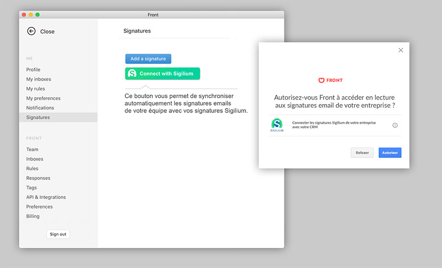 1/ La personne en charge du compte clique sur le bouton pour connecter les signatures emails Sigilium avec votre outil.